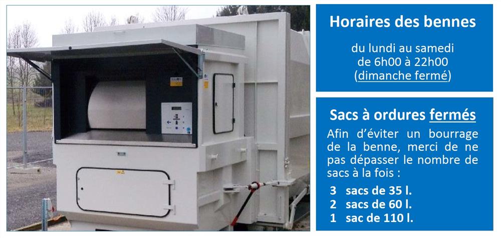 Horaires des bennes : du lundi au samedi de 06h00 à 22h00 (dimanche fermé)